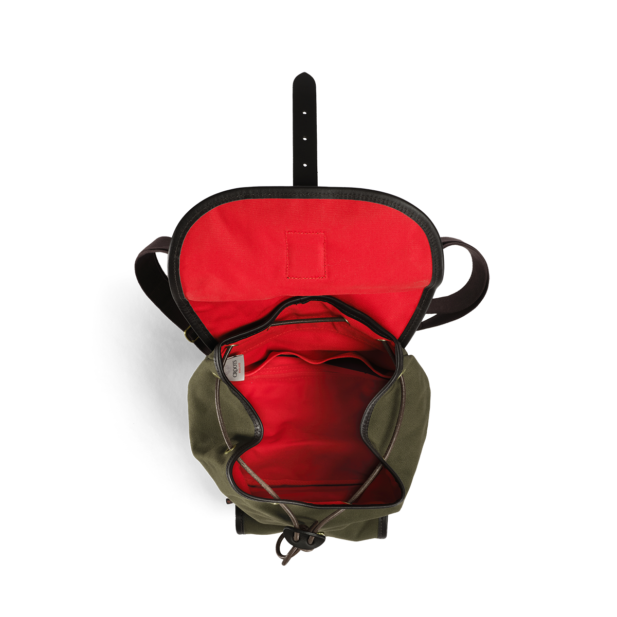 Our Rucksack is a round-style rucksack with a leather draw-cord closure plus leather strap and buckle fastening, full-width internal pocket, double webbing shoulder straps and gusseted outer pocket.
